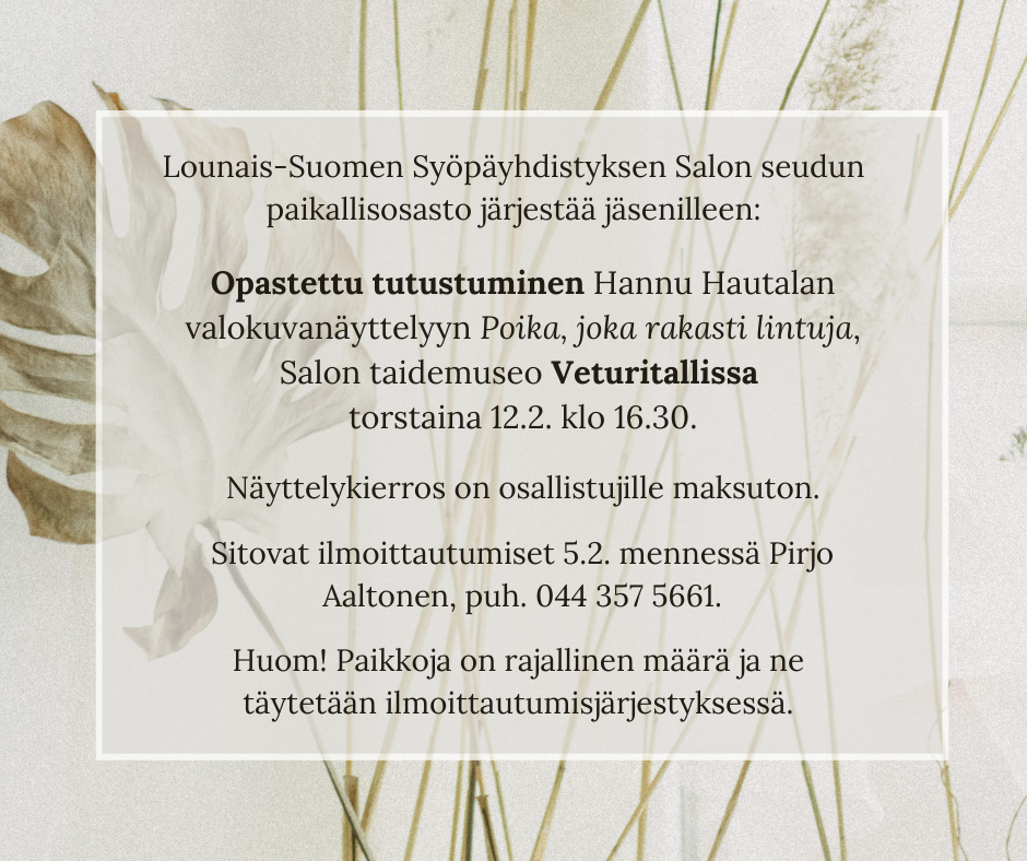 Opastettu tutustuminen Hannu Hautalan valokuvanäyttelyyn Poika, joka rakasti lintuja, Salon taidemuseo Veturitallissa torstaina 12.2. klo 16.30. Näyttelykierros on osallistujille maksuton.