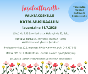Kesäteatteriretki Valkeakoskelle Katri-musikaaliin lauantaina 11.7. Hinta 65 euroa sisältäen esityksen, lounaan ja kuljetuksen. Merkitse päivä jo nyt kalenteriisi ja lähde mukaan mukavalle kesäreissulle! Lisätiedot ja ilmoittautumiset puh. 044 357 5661, Pirjo Aaltonen.